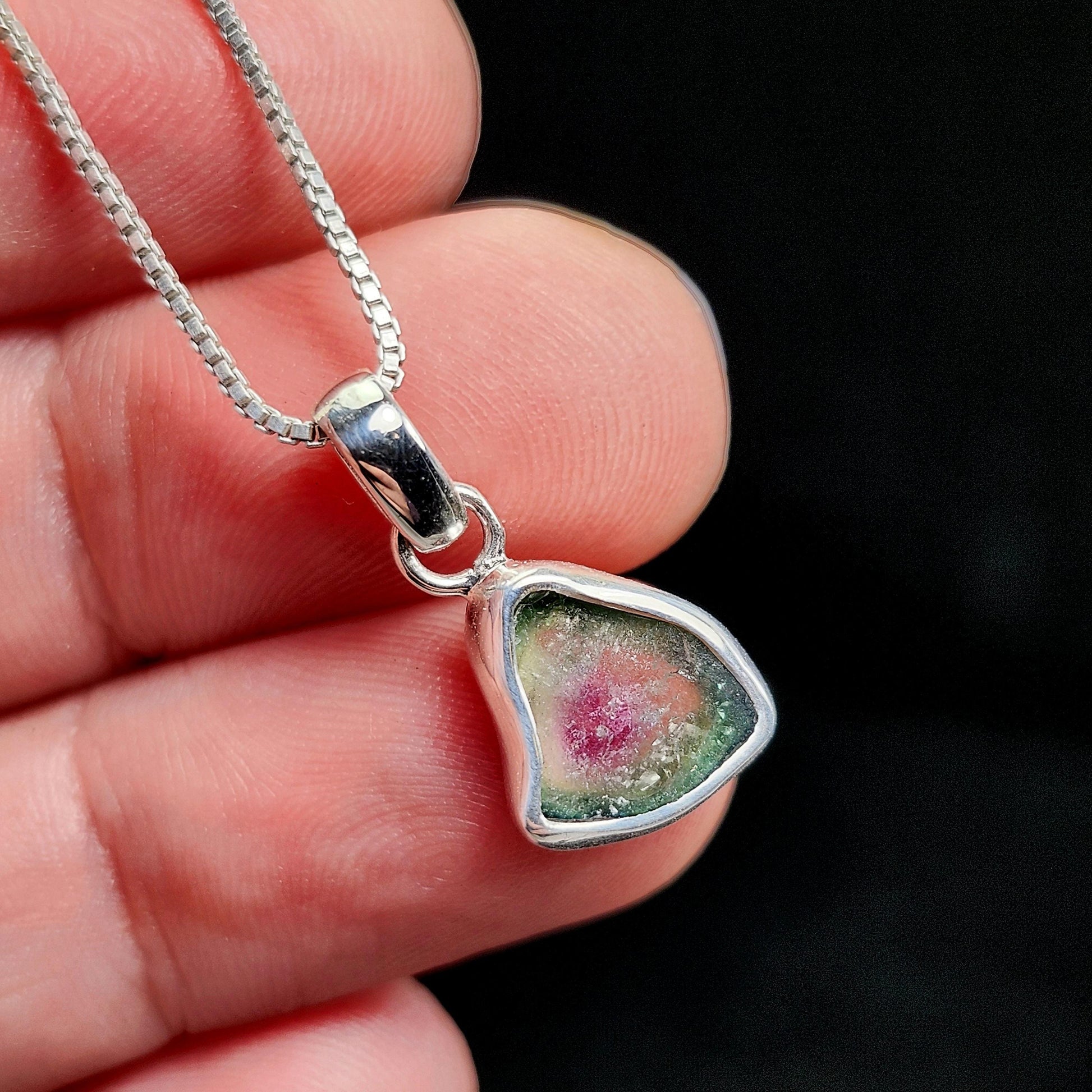 This Watermelon Tourmaline gemstone slice displays juicy pink centered in the middle of a green border. This crystal has been custom created into a sturdy piece of jewelry using .925 Sterling Silver. This pendant measures approximately 18mm by 9mm. The silver chain used in the photos is to help envision how this pendant will look while adorned but is not included in the listing.