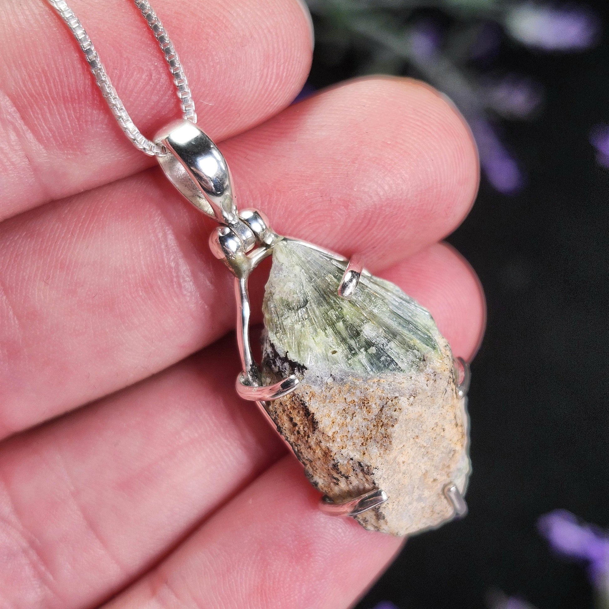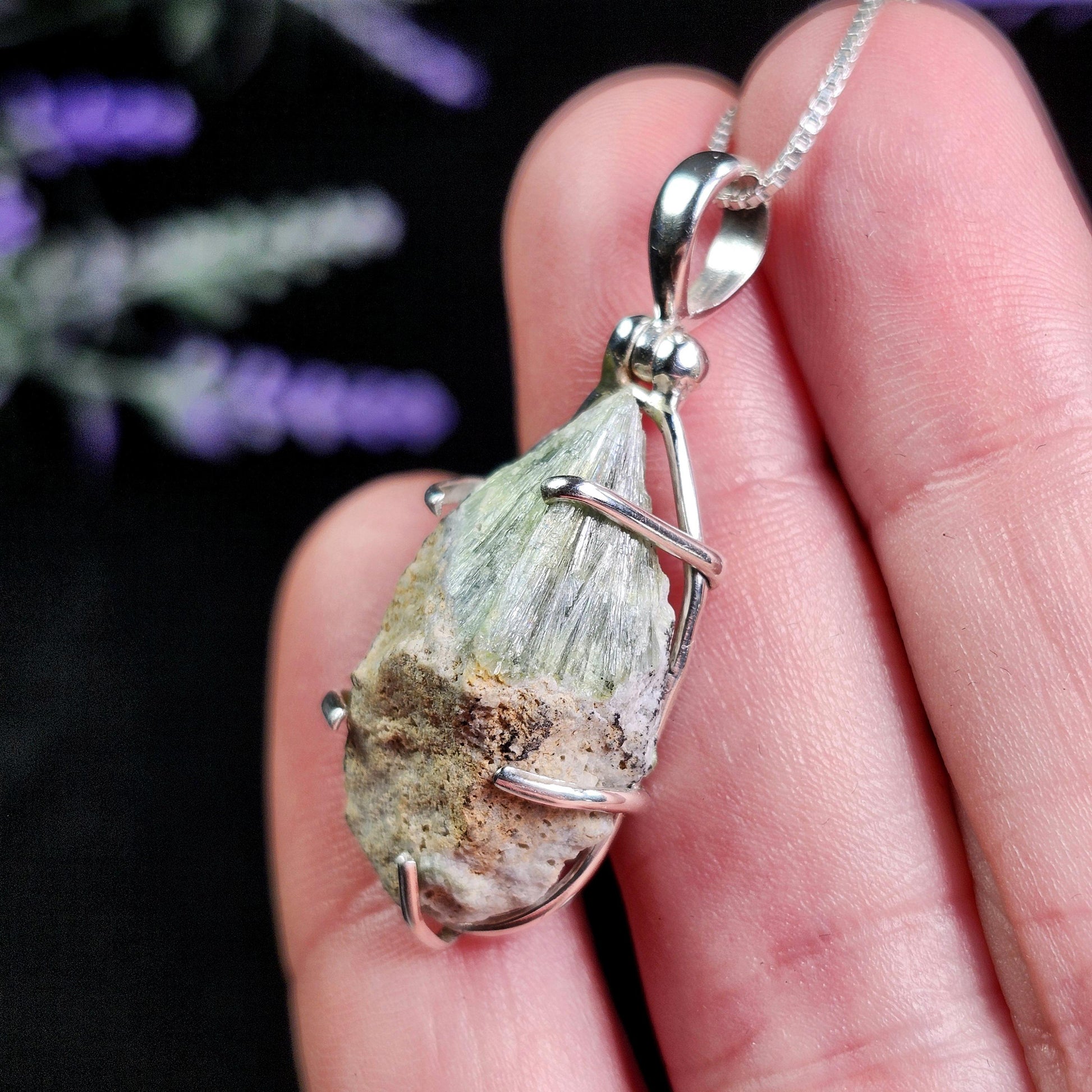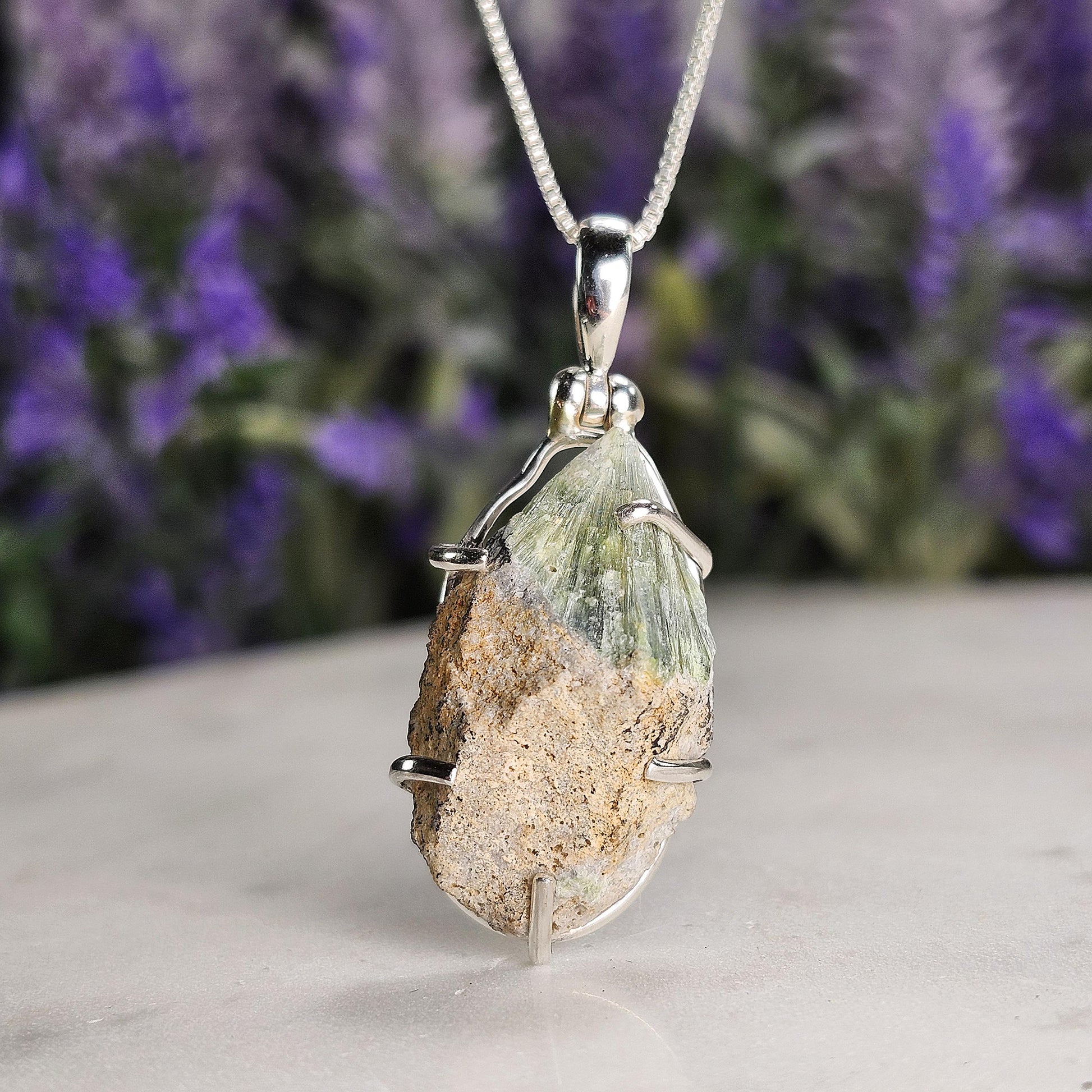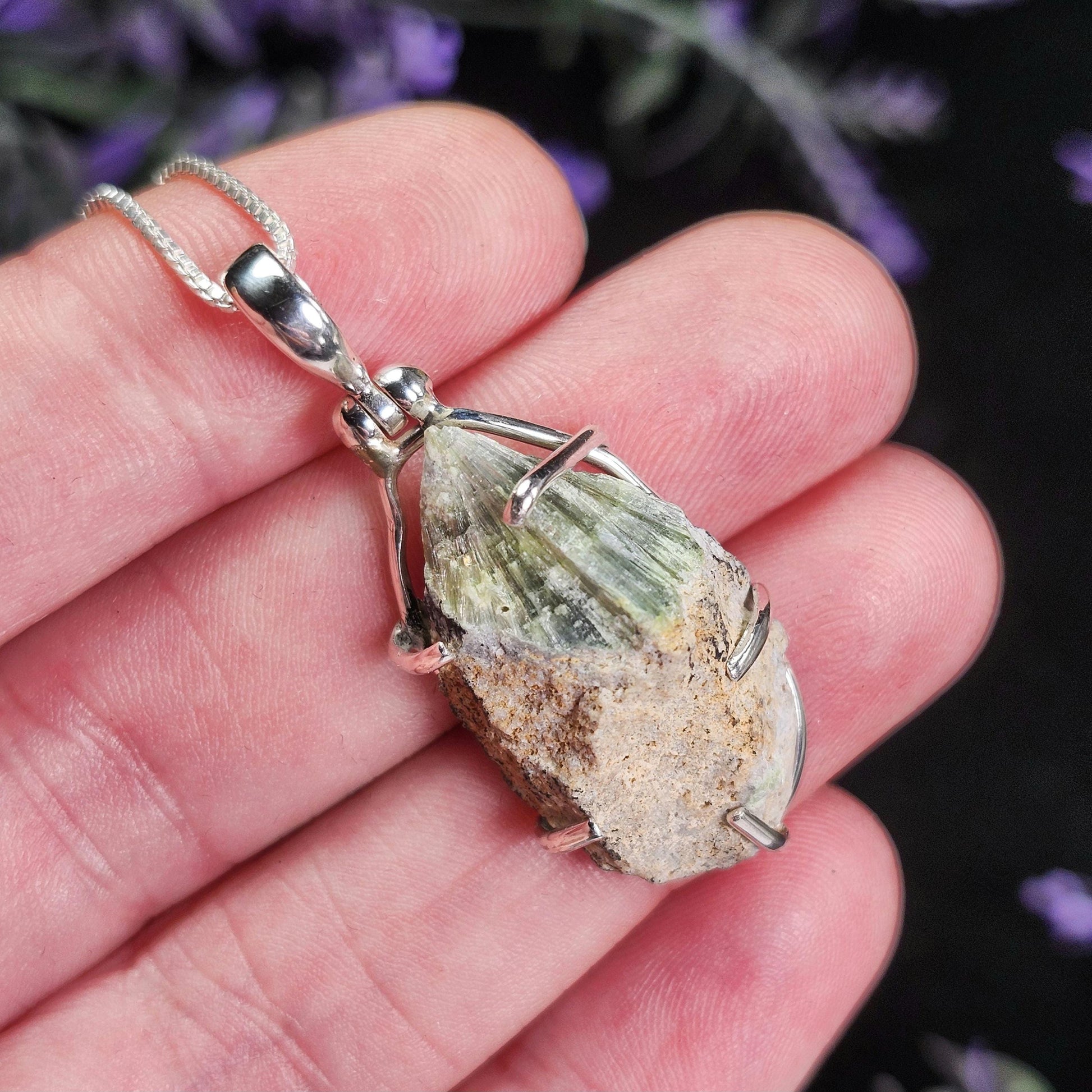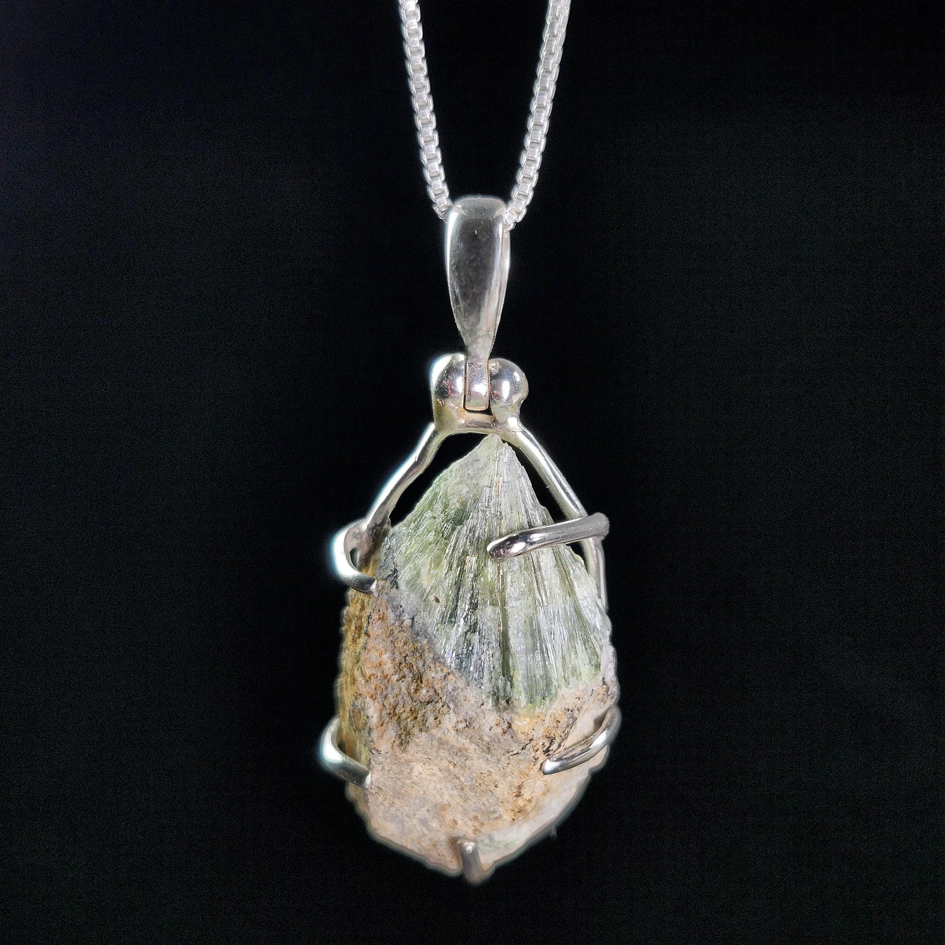 Wavellite crystals are known for their radial spray patterns, which is evident in this striated specimen. This raw stone displays green radial striations paired with a rough brown matrix. This crystal has been handpicked and processed into an intentional piece of jewelry using .925 Sterling Silver. This pendant measures approximately 37mm by 14mm. The silver chain used in the photos is to help envision how this pendant will look while adorned but is not included in the listing.
