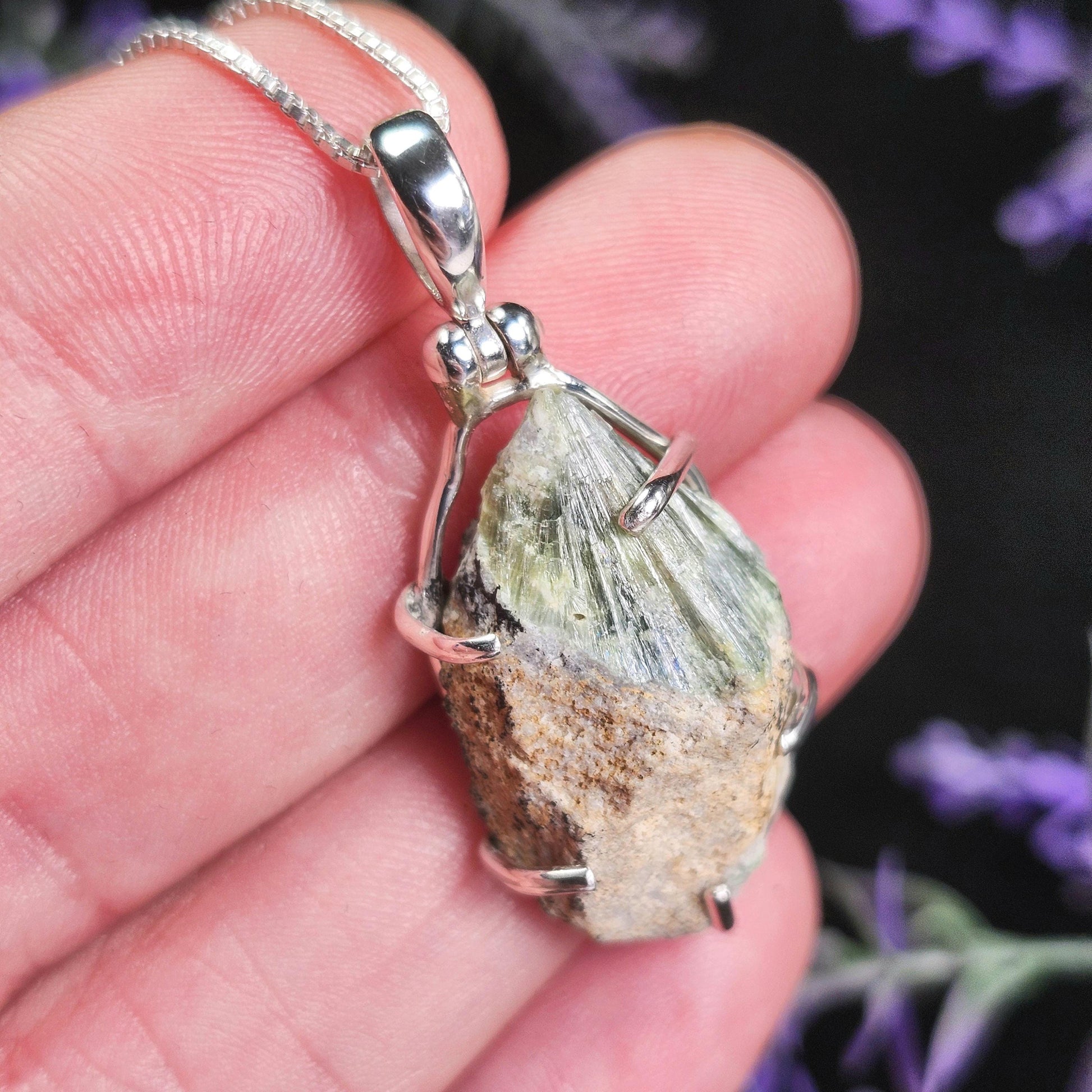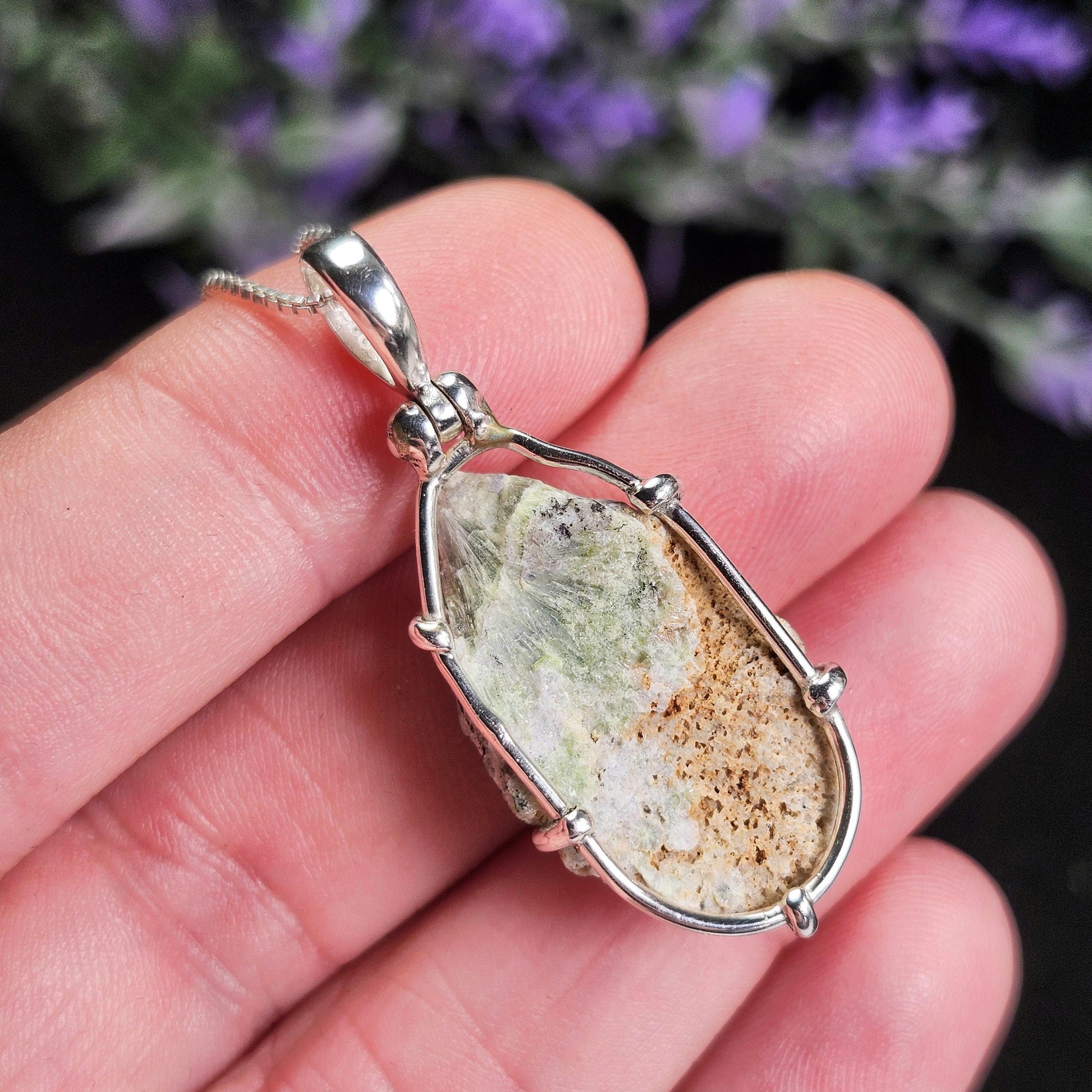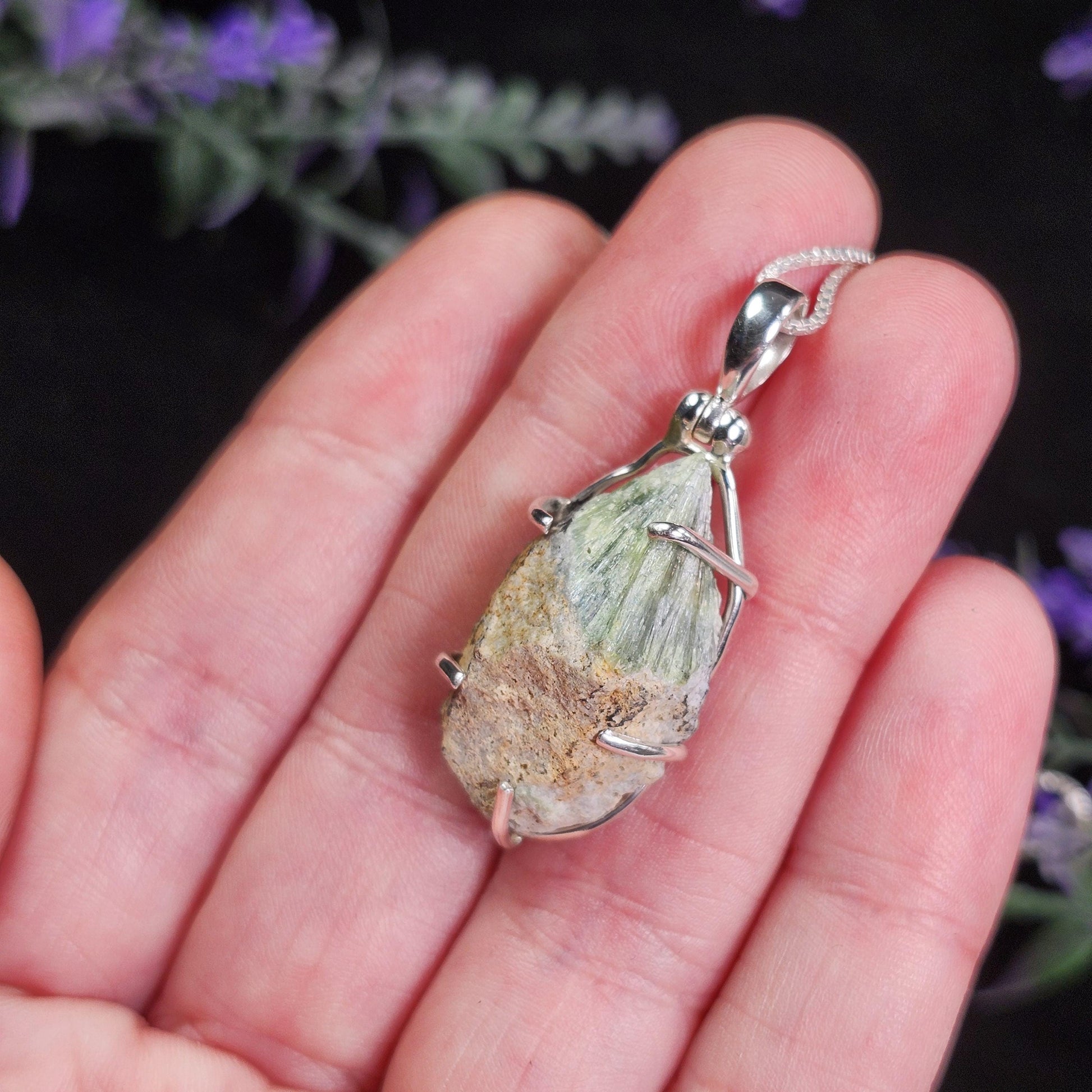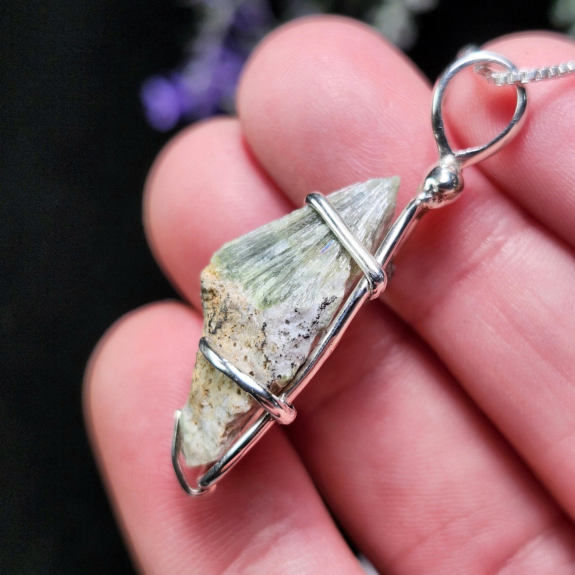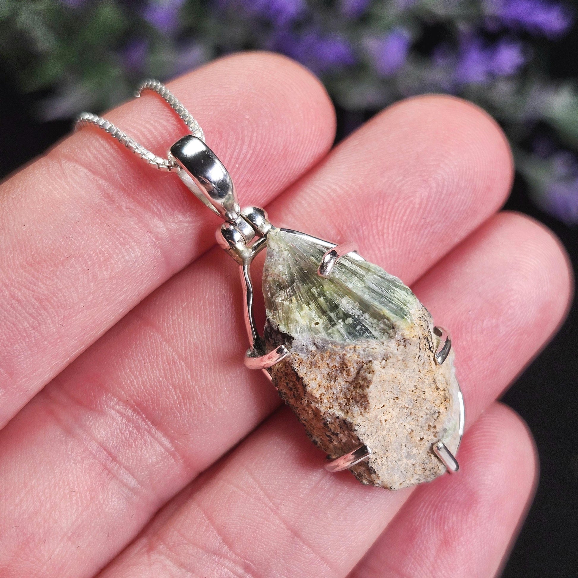 Wavellite crystals are known for their radial spray patterns, which is evident in this striated specimen. This raw stone displays green radial striations paired with a rough brown matrix. This crystal has been handpicked and processed into an intentional piece of jewelry using .925 Sterling Silver. This pendant measures approximately 37mm by 14mm. The silver chain used in the photos is to help envision how this pendant will look while adorned but is not included in the listing.