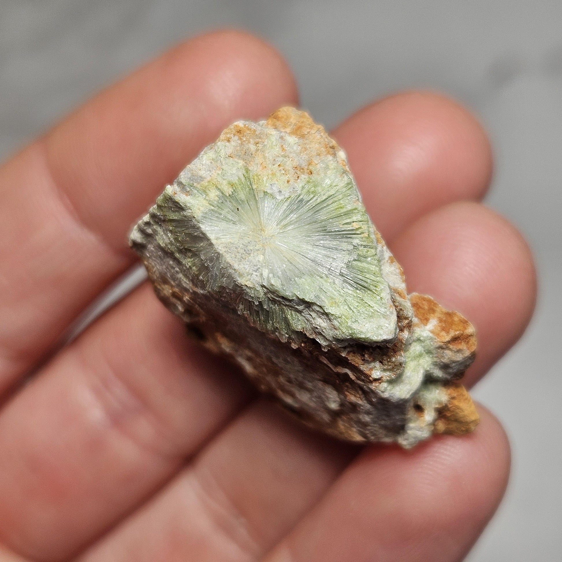 These raw Wavellite crystals from Arkansas, USA exhibit radial spray patterns, showing off their growth habits. Many of these partial sprays have a sparkle to them and a unique gemmy nature. The tones of green range from light mint to deep chartreuse and each have their own individual characteristics. This green mineral grows within a grey matrix stone.