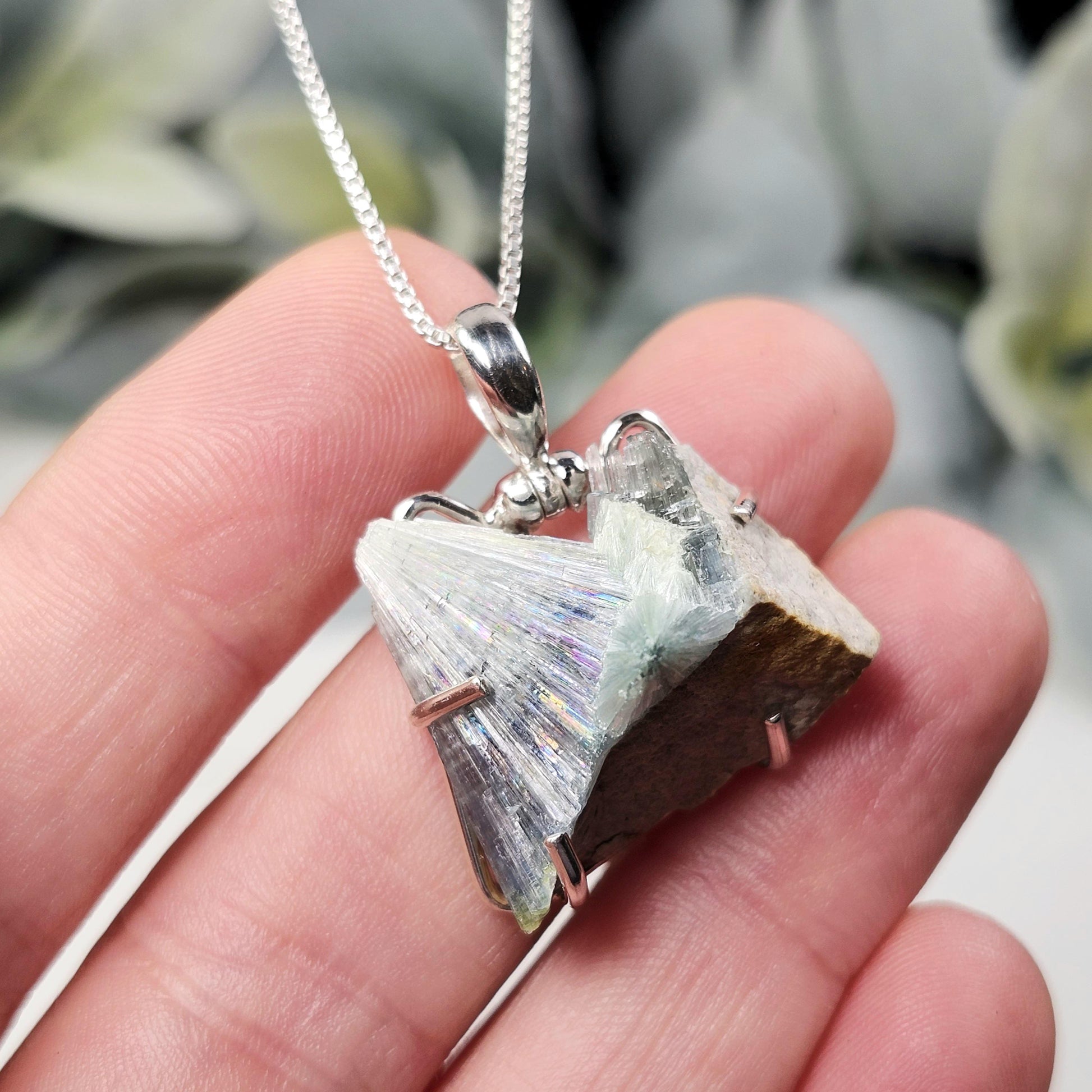 Wavellite crystals are known for their radial spray patterns, which is evident on this raw specimen. This stone exhibits blue-grey coloring, with deep striations, small rainbow iridescence, and pronounced terminations. This crystal has been handpicked and custom created into a sturdy piece of jewelry using .925 Sterling Silver. This pendant measures approximately 27mm by 23mm. The silver chain used in the photos is to help envision how this pendant will look while adorned but is not included in the listing.