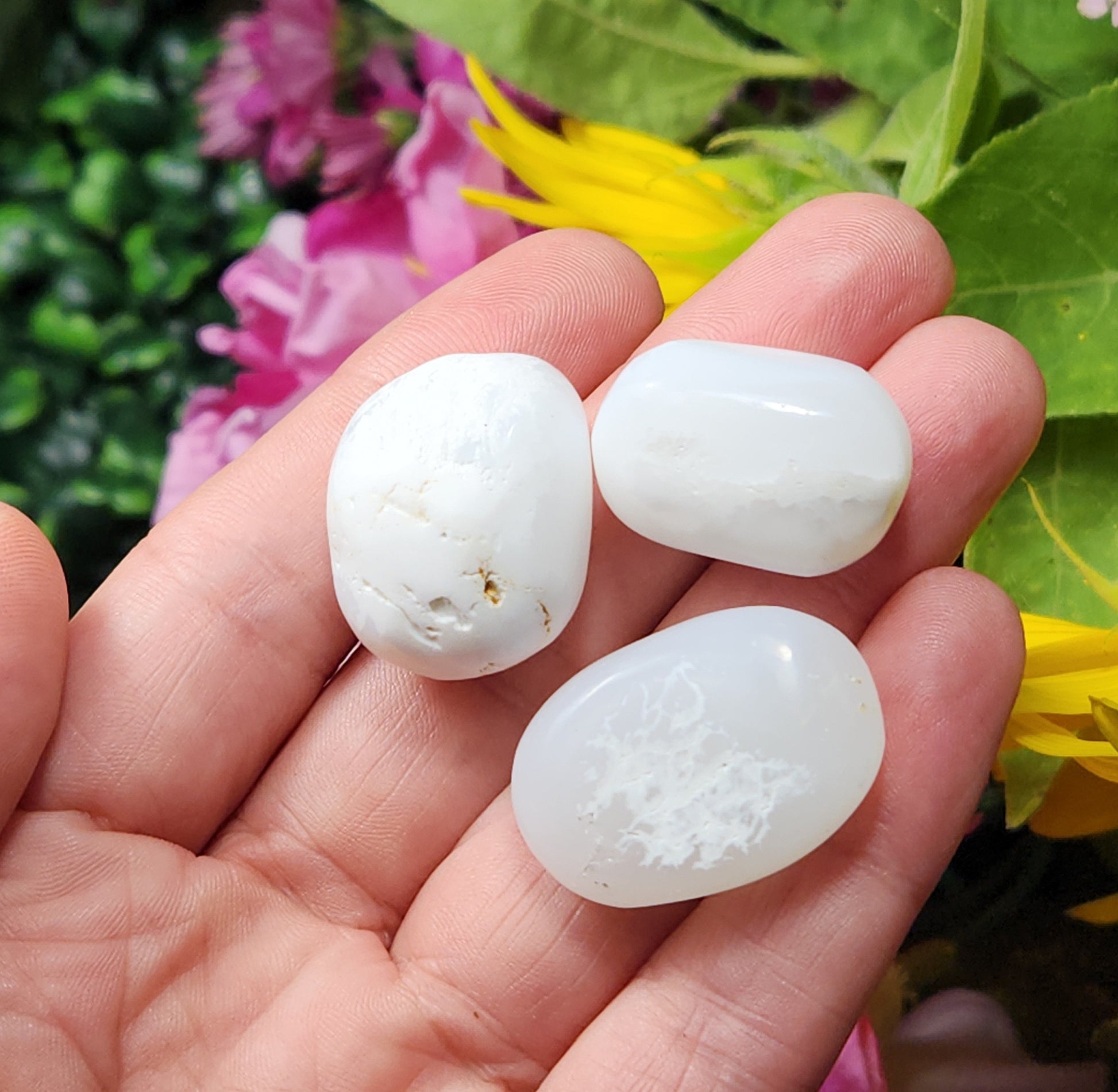 These White Jade stones from Indonesia have been tumbled to a smooth polish. They have rounded, freeform shapes and range from opaque to slightly translucent. Each specimen measures between .75 inches and 1 inch.