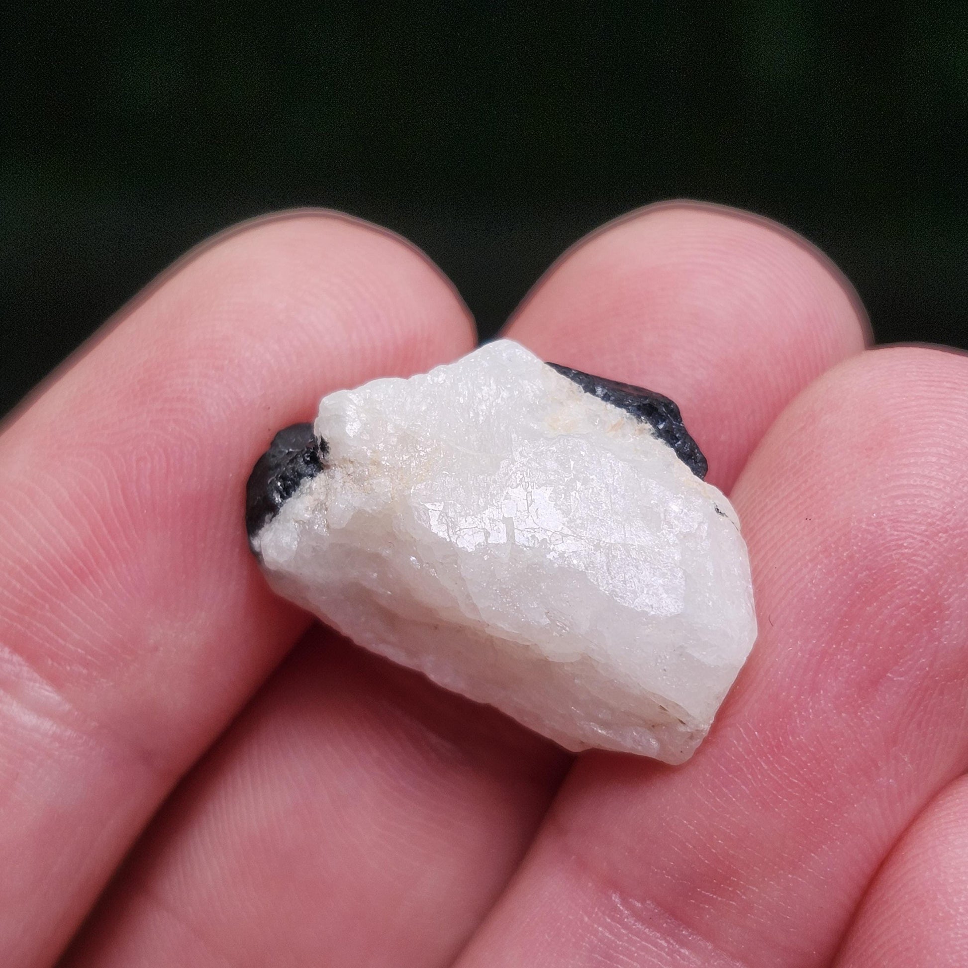 This terminated Phenacite crystal from Nigeria exhibits a milky white coloring contrasted by dark, black Tourmaline inclusions. This specimen measures approximately 20mm by 12mm by 7mm and weighs 4 grams.