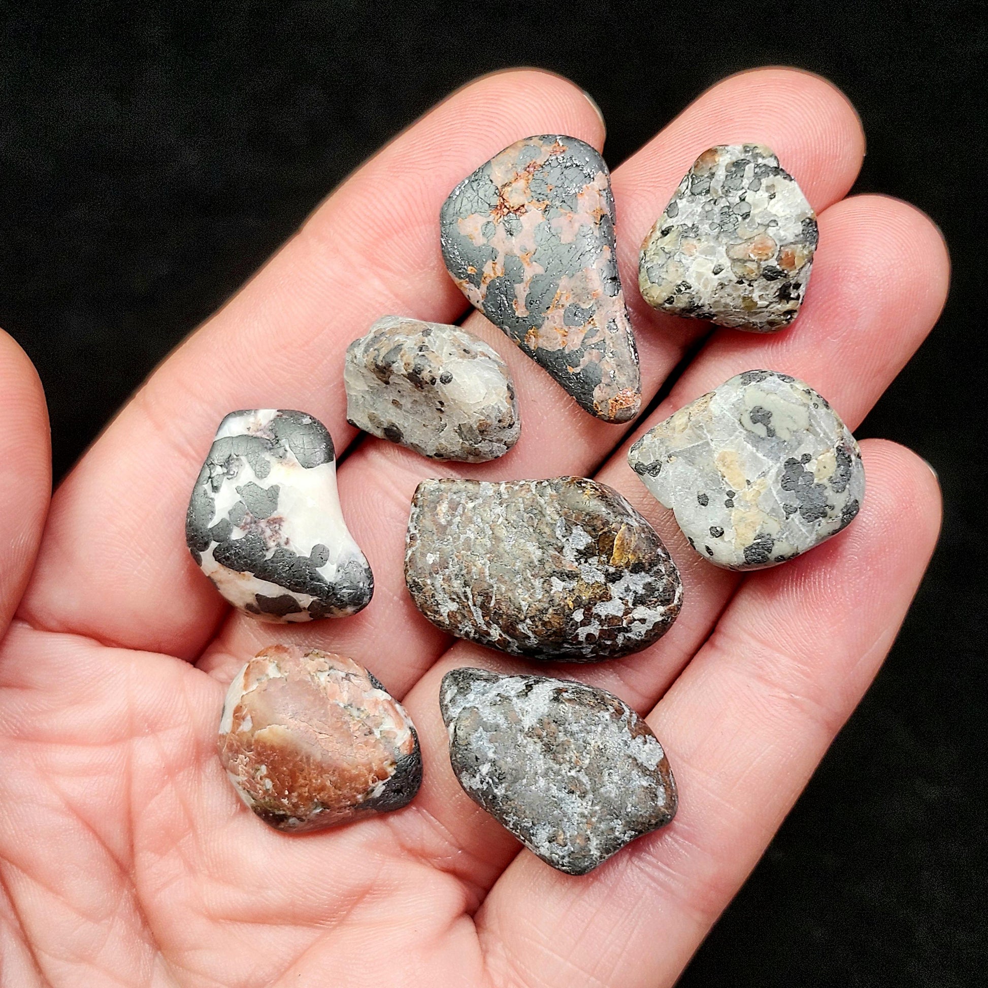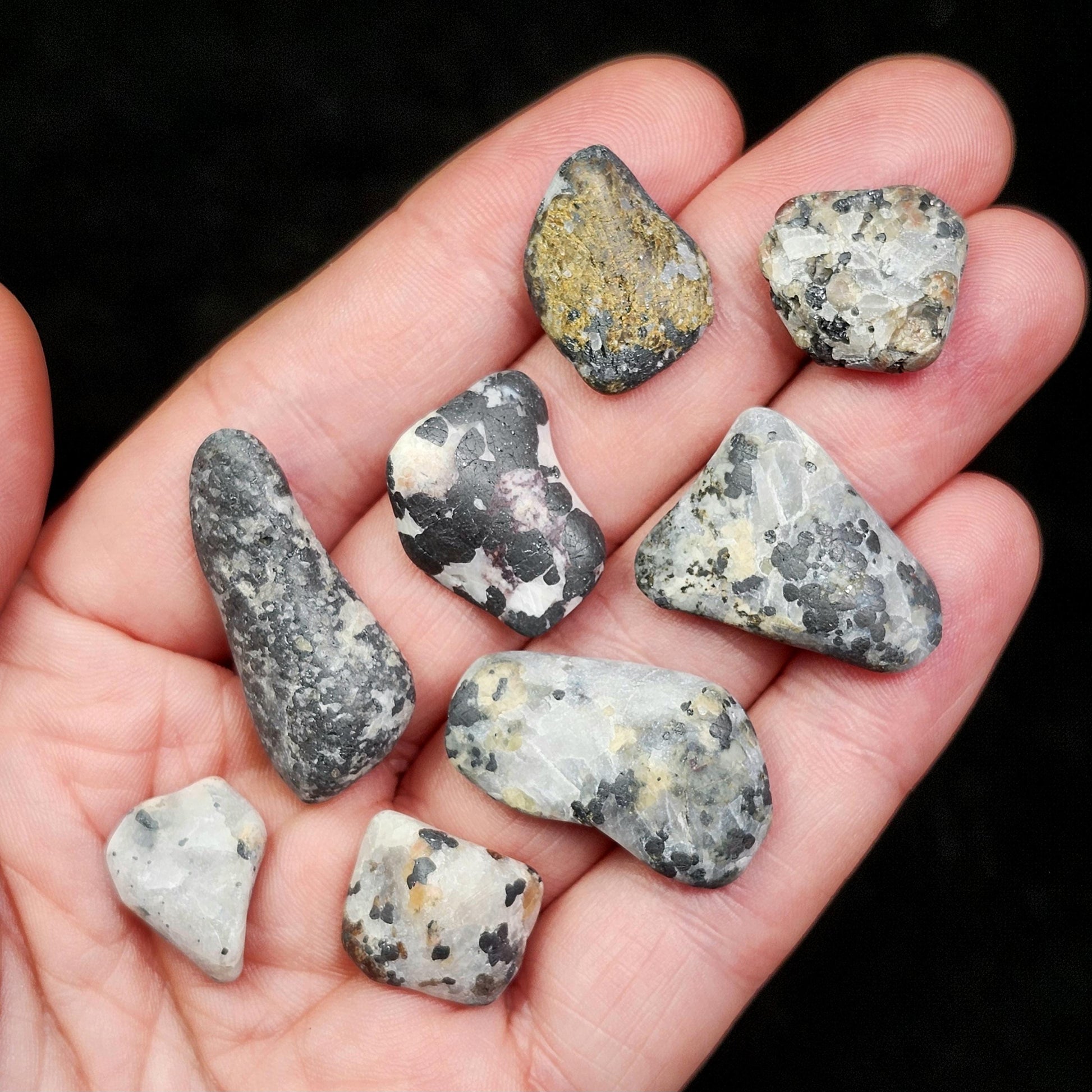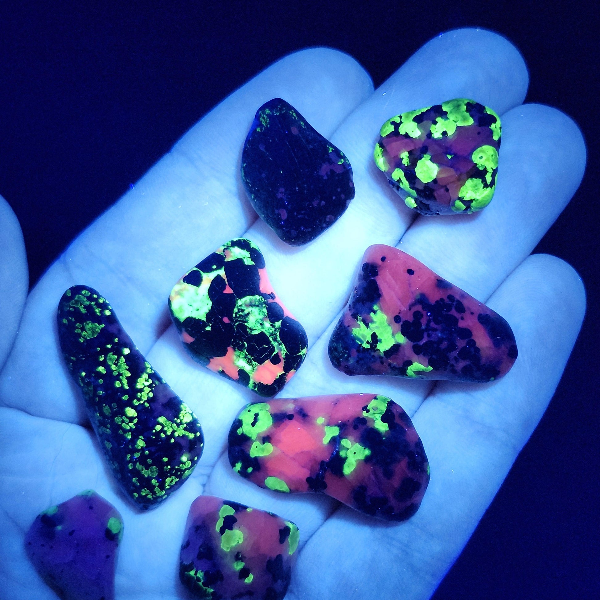 These Willemite stones come from the Sterling Hill Mine in New Jersey. With freeform shapes, they have been tumbled to smooth polish. They exhibit an array of marbled patterns with possible white, grey, black, and golden-brown coloring. This crystal glows with a colorful, saturated brilliance when under a black light - a rare quality in the mineral kingdom! The fluorescence ranges from subtle to strong, with pink, green, or yellow hues.