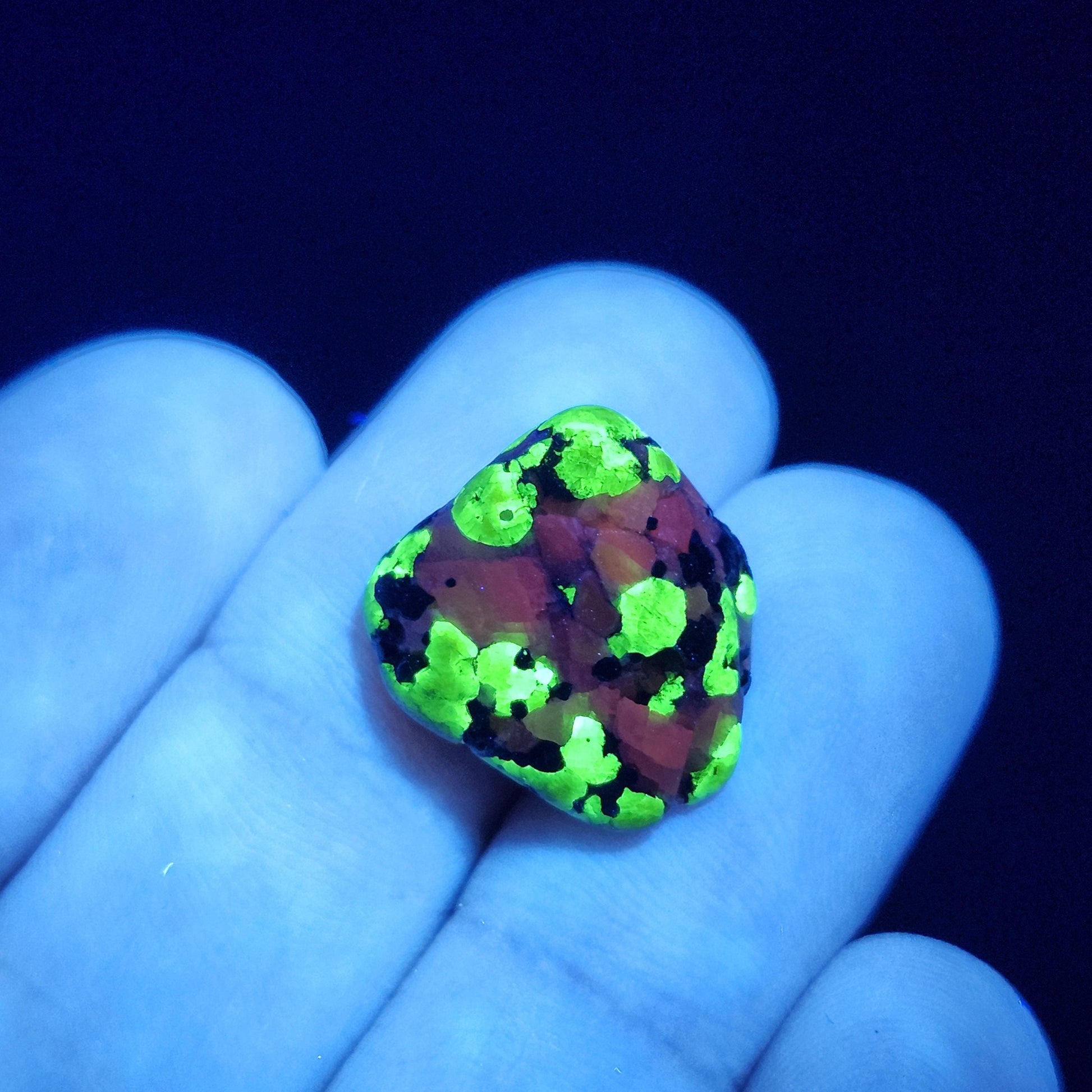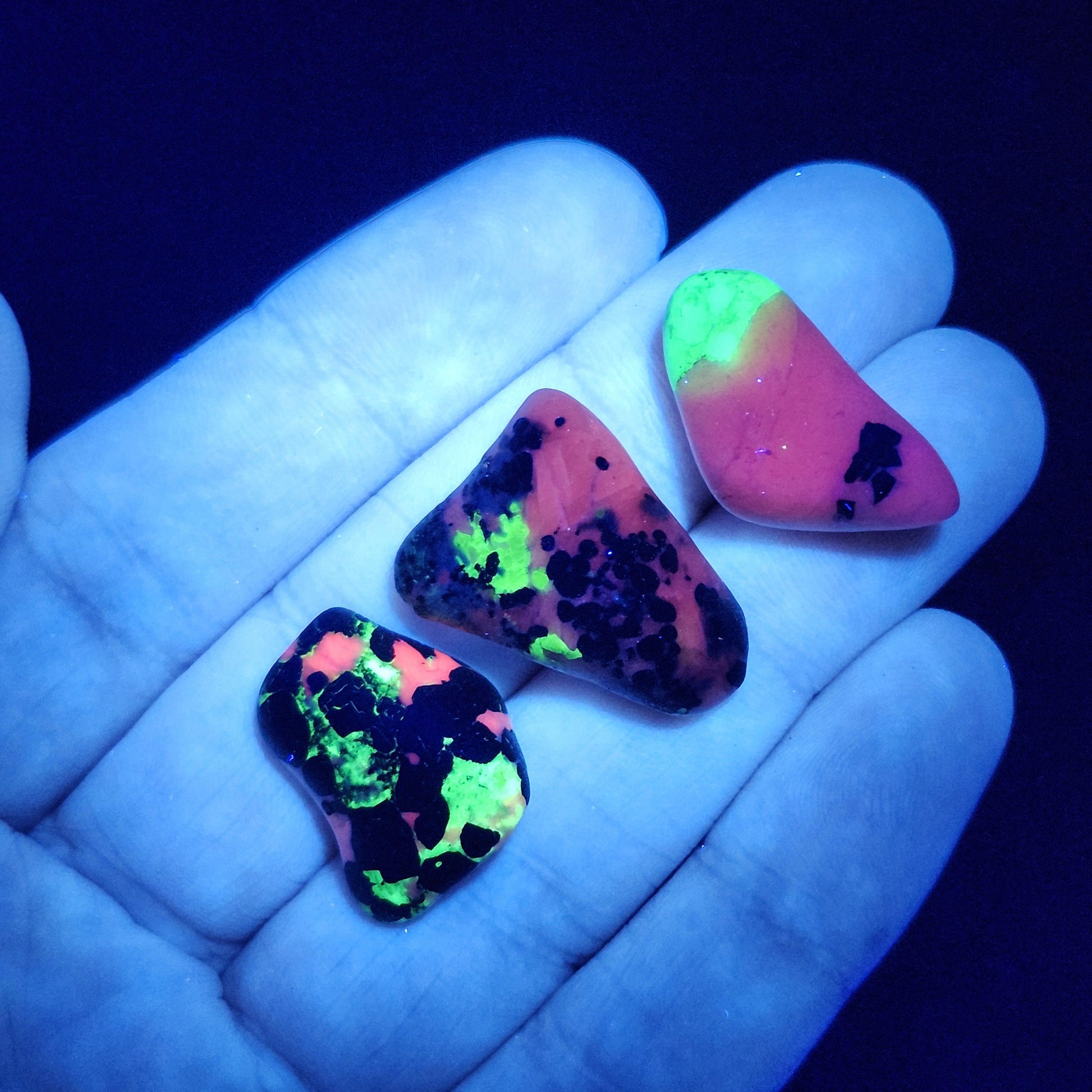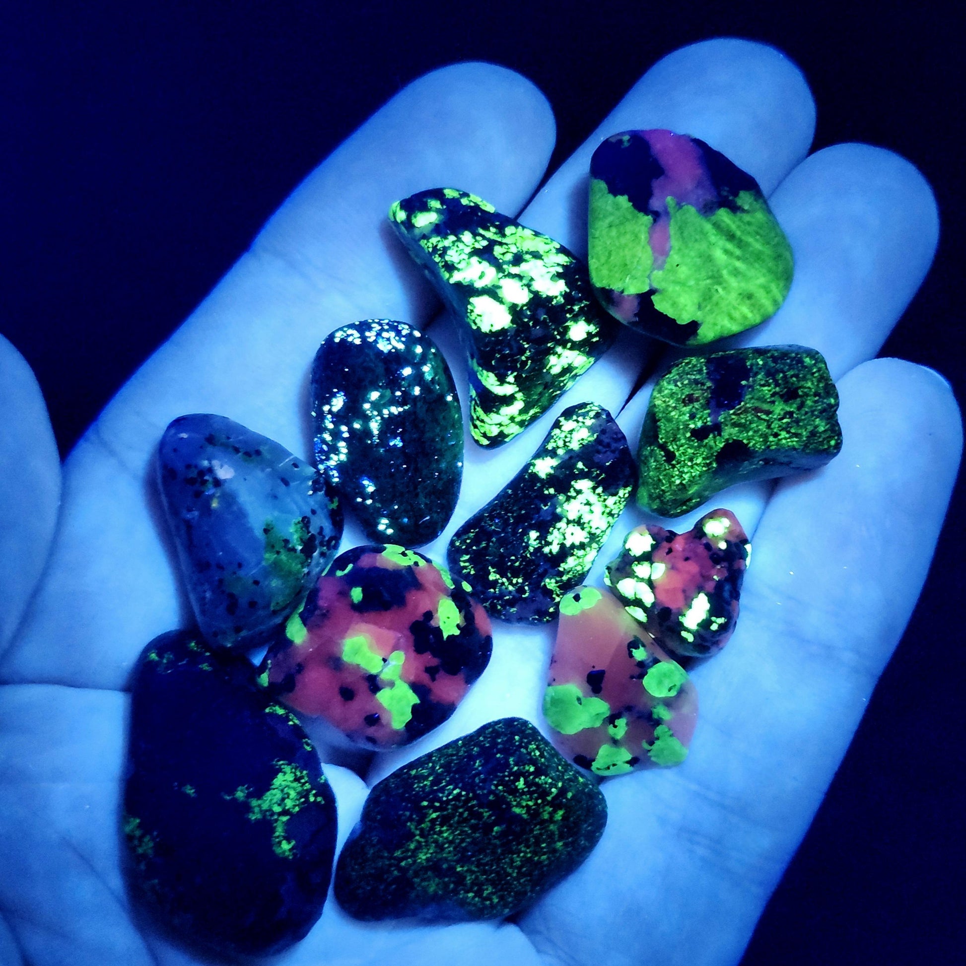 These Willemite stones come from the Sterling Hill Mine in New Jersey. With freeform shapes, they have been tumbled to smooth polish. They exhibit an array of marbled patterns with possible white, grey, black, and golden-brown coloring. This crystal glows with a colorful, saturated brilliance when under a black light - a rare quality in the mineral kingdom! The fluorescence ranges from subtle to strong, with pink, green, or yellow hues.