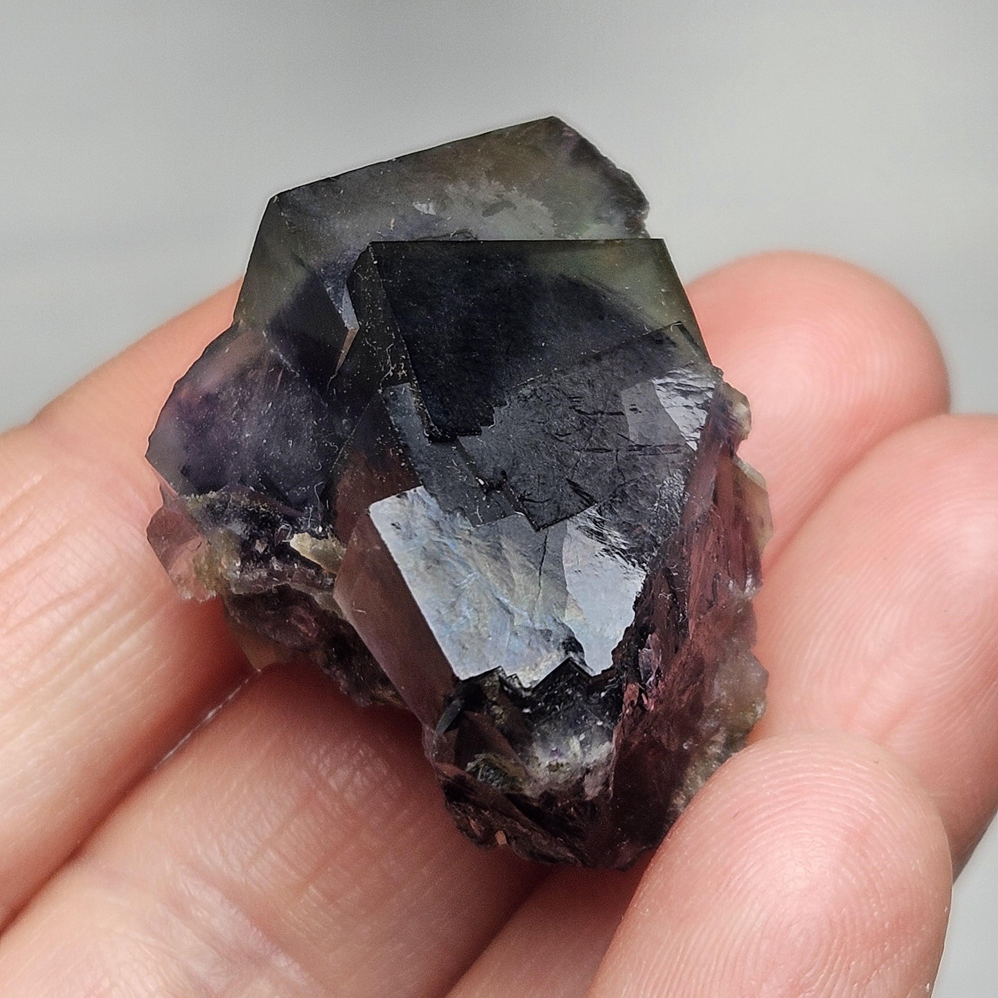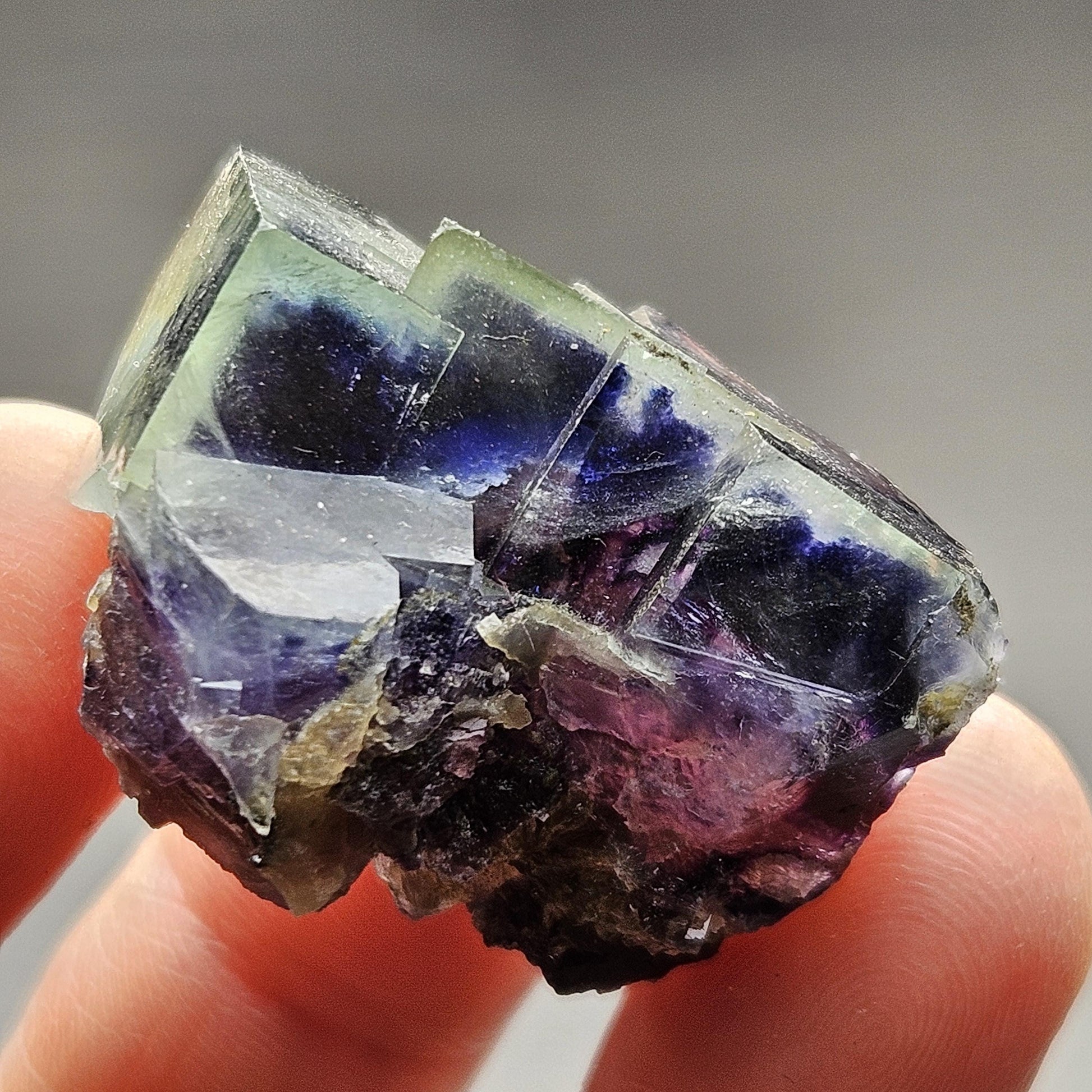 This specimen, from the prized Cherry Pocket in the Yindu region of Inner Mongolia, displays cubic growth with distinct phantom color zoning. A highly UV reactive specimen, this piece glows a vibrant bright blue when exposed to UV rays. It exhibits a range of colors, including violet, blue, green and clear Fluorite and has inclusions of golden Siderite attached with botryoidal growth. This specimen measures approximately 30mm by 23mm by 20mm and weighs 20.8 grams.
