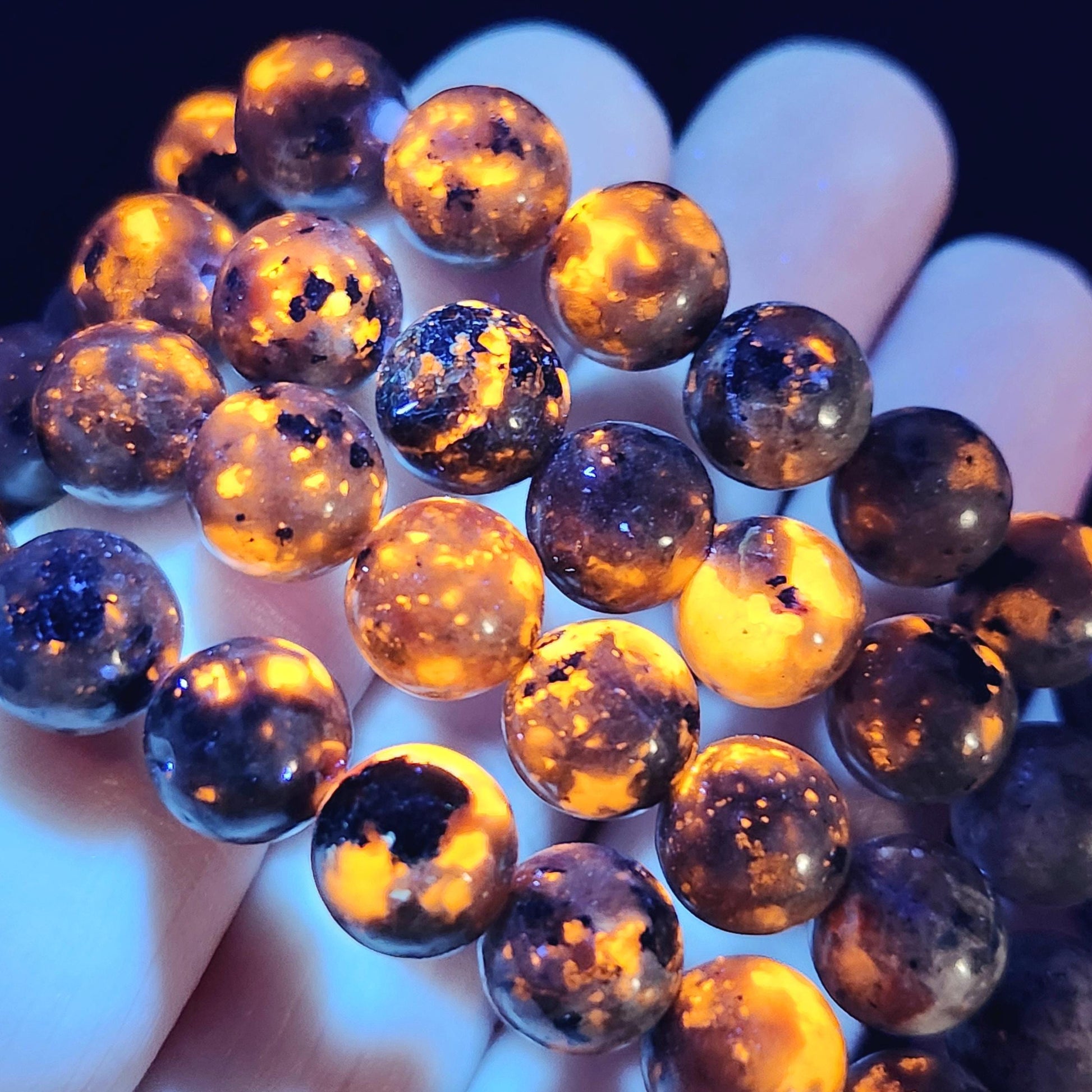 Originally discovered along the shores of Lake Superior, Yooper Light Stones (also known by a more common, trademarked name) are a fluorescent marvel hiding in plain sight. By daylight, these gray stones appear calm and unassuming, but under UV light, they burst to life with fiery orange and yellow veins. These Yooper Light stretch bracelets are created with 8mm beads that have been polished to a high sheen. Each bracelet measures approximately 7 inches.