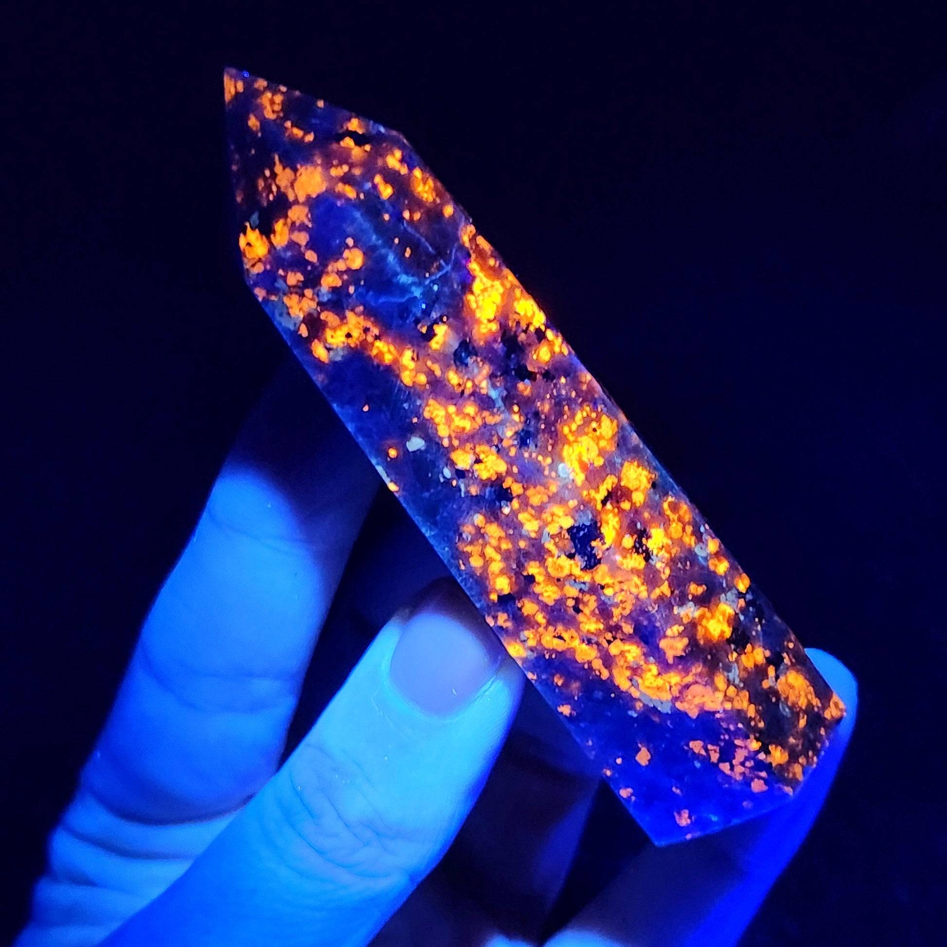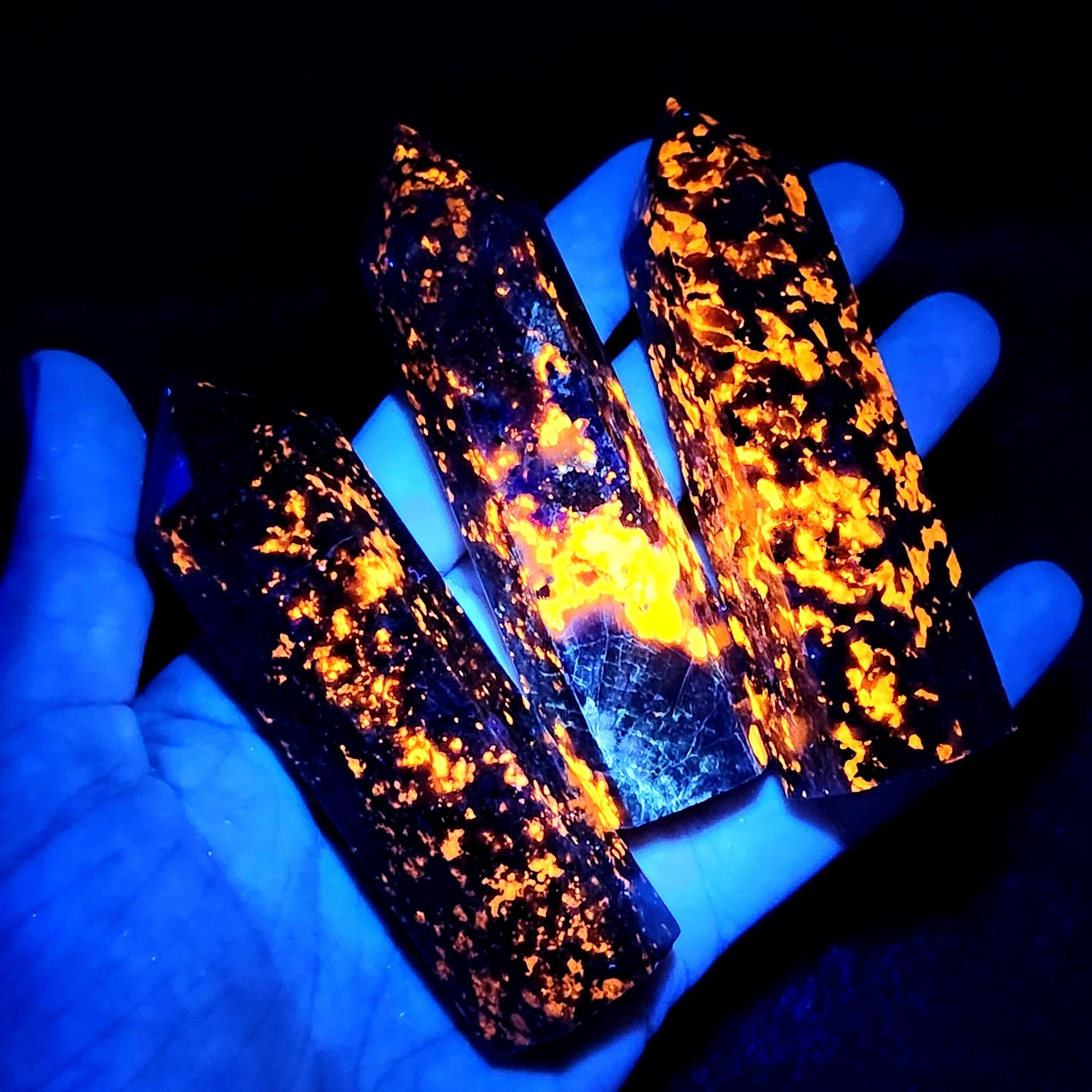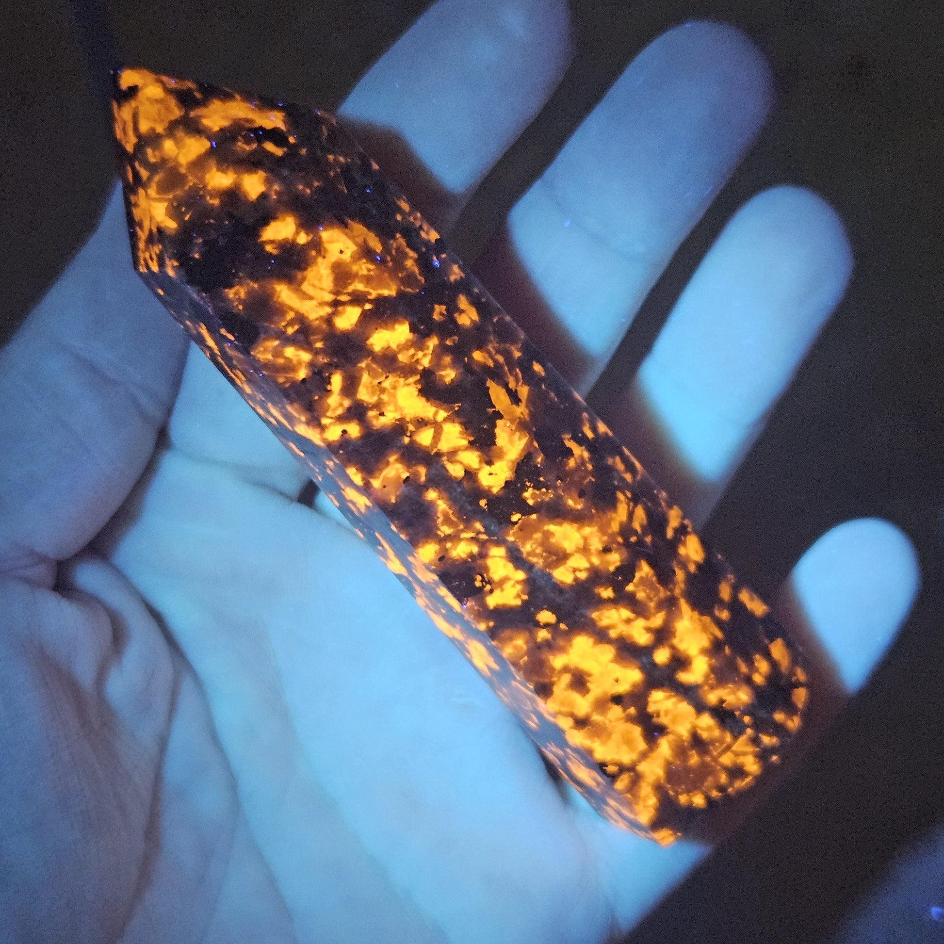 Originally discovered along the shores of Lake Superior, Yooper Light Stones (also known by a more common, trademarked name) are a fluorescent marvel hiding in plain sight. By daylight, these gray stones appear calm and unassuming, but under UV light, they burst to life with fiery orange and yellow veins. These carved towers have a high polish with shining terminated points and flat bases that allow them to self-stand. Each specimen measures between 3.25 inches and 3.5 inches.