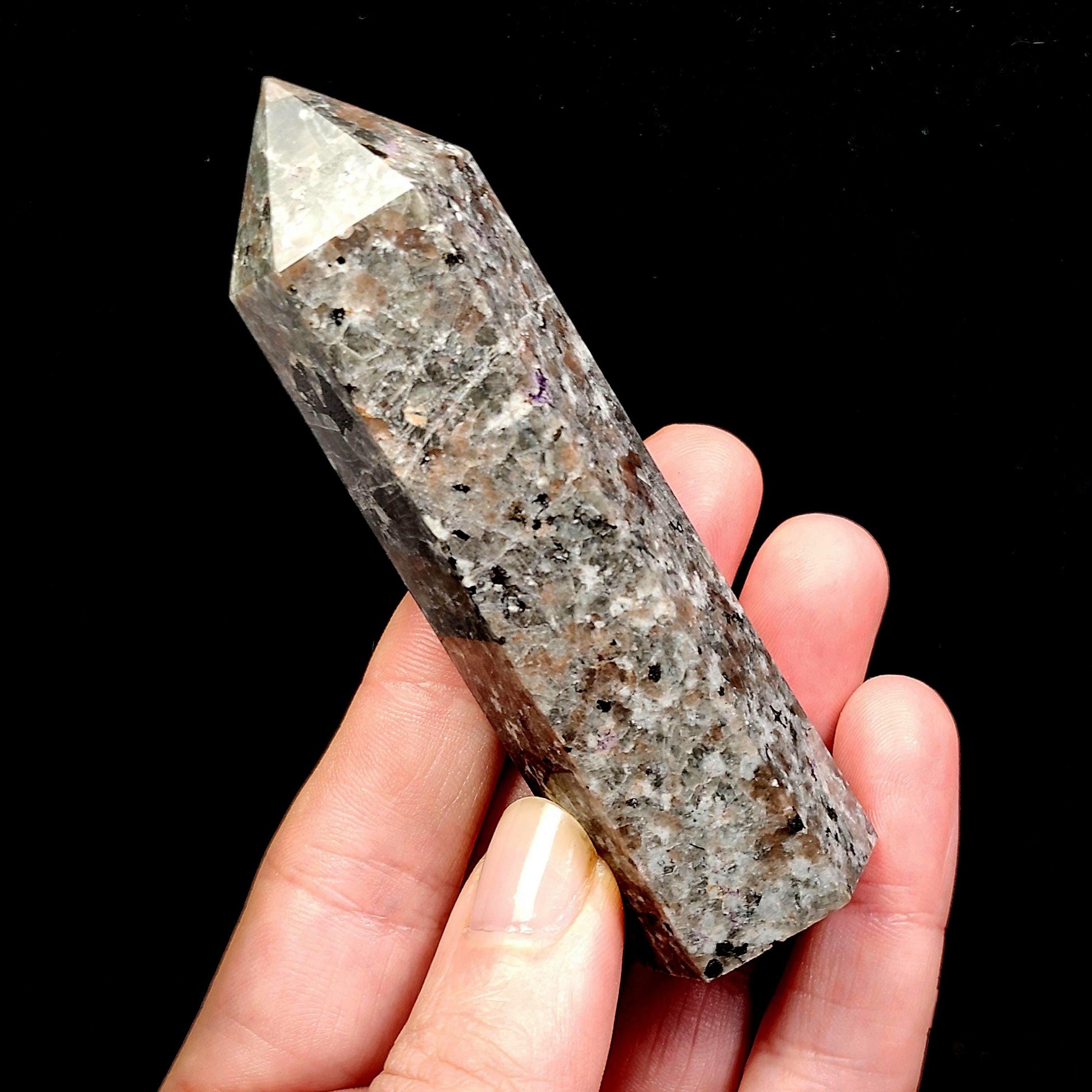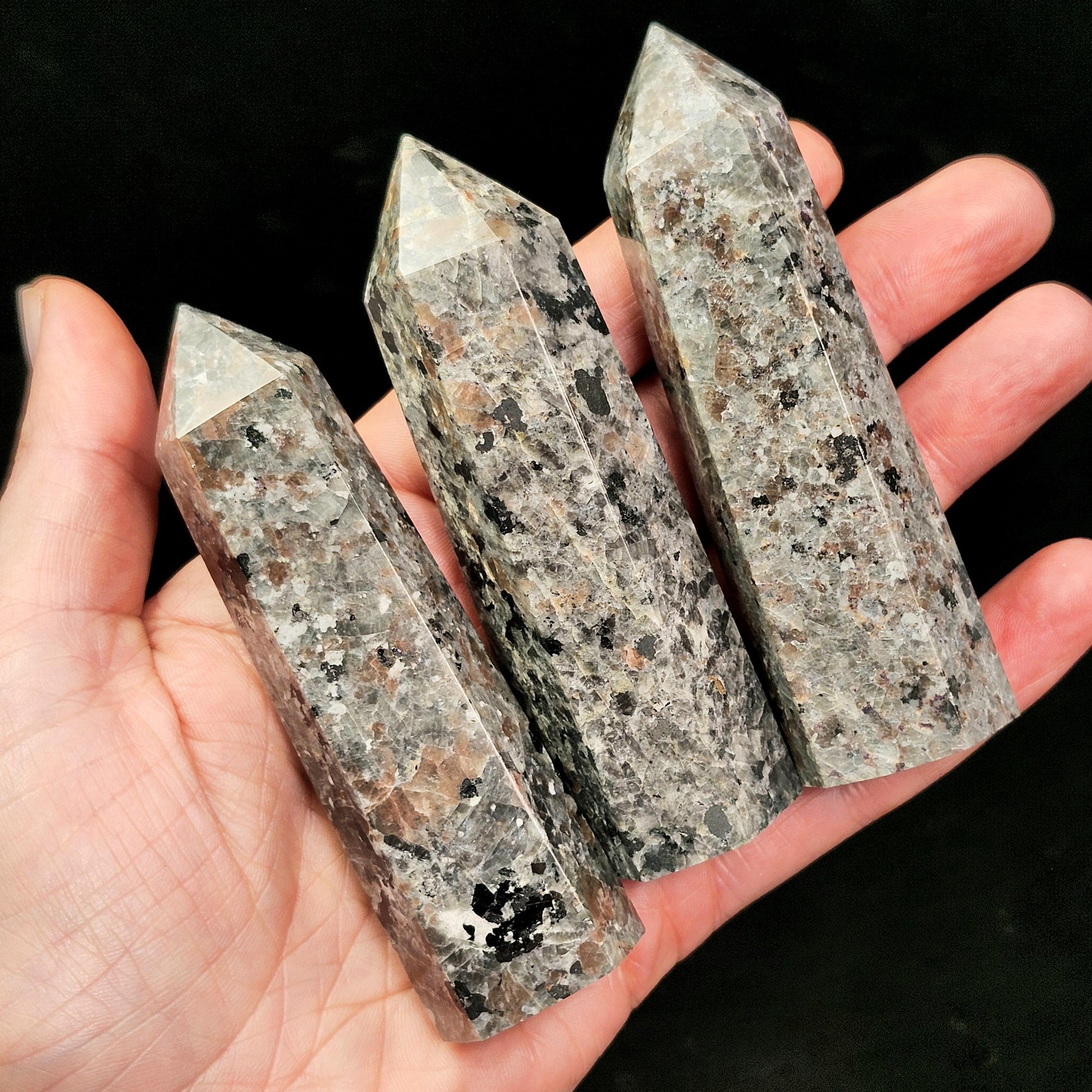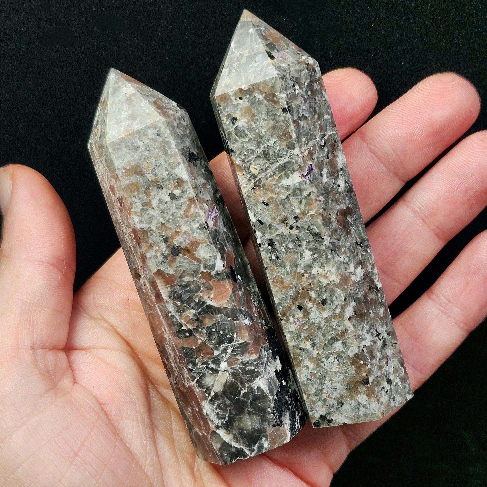 Originally discovered along the shores of Lake Superior, Yooper Light Stones (also known by a more common, trademarked name) are a fluorescent marvel hiding in plain sight. By daylight, these gray stones appear calm and unassuming, but under UV light, they burst to life with fiery orange and yellow veins. These carved towers have a high polish with shining terminated points and flat bases that allow them to self-stand. Each specimen measures between 3.25 inches and 3.5 inches.