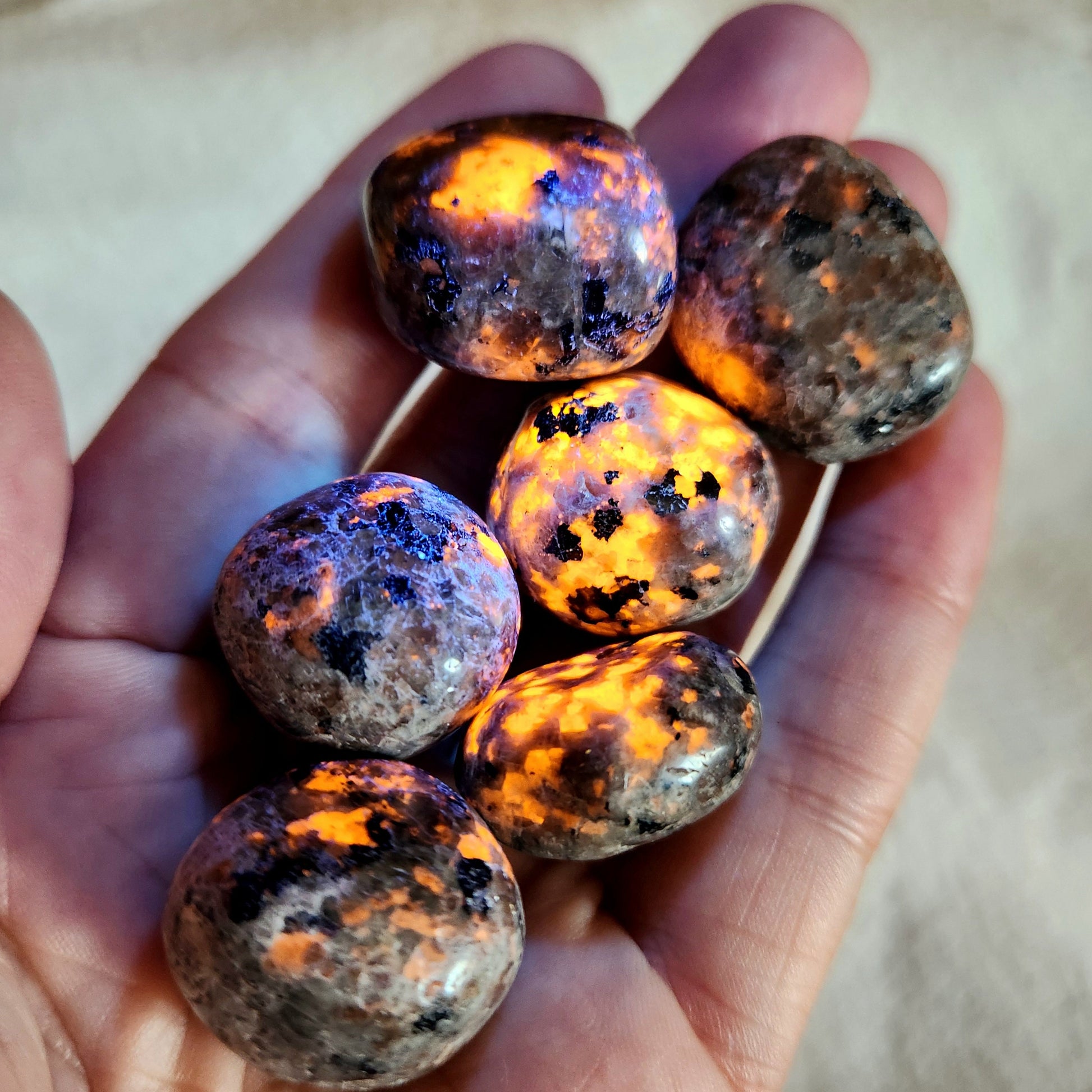 Formed primarily of syenite infused with fluorescent sodalite, these tumbled Yooper Light Stones are 100% natural and sourced from Michigan, a rare geological phenomenon found only in select glacial deposits. This stone is thought to help clear illusions, bringing the truth forward and encouraging personal and spiritual growth.